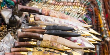 Nepalese curved knife which is a symbol of bravery, used historically by Gurkha soldiers. Available in functional or ornamental versions. The khukuri's cultural significance and craftsmanship make it a standout souvenir.